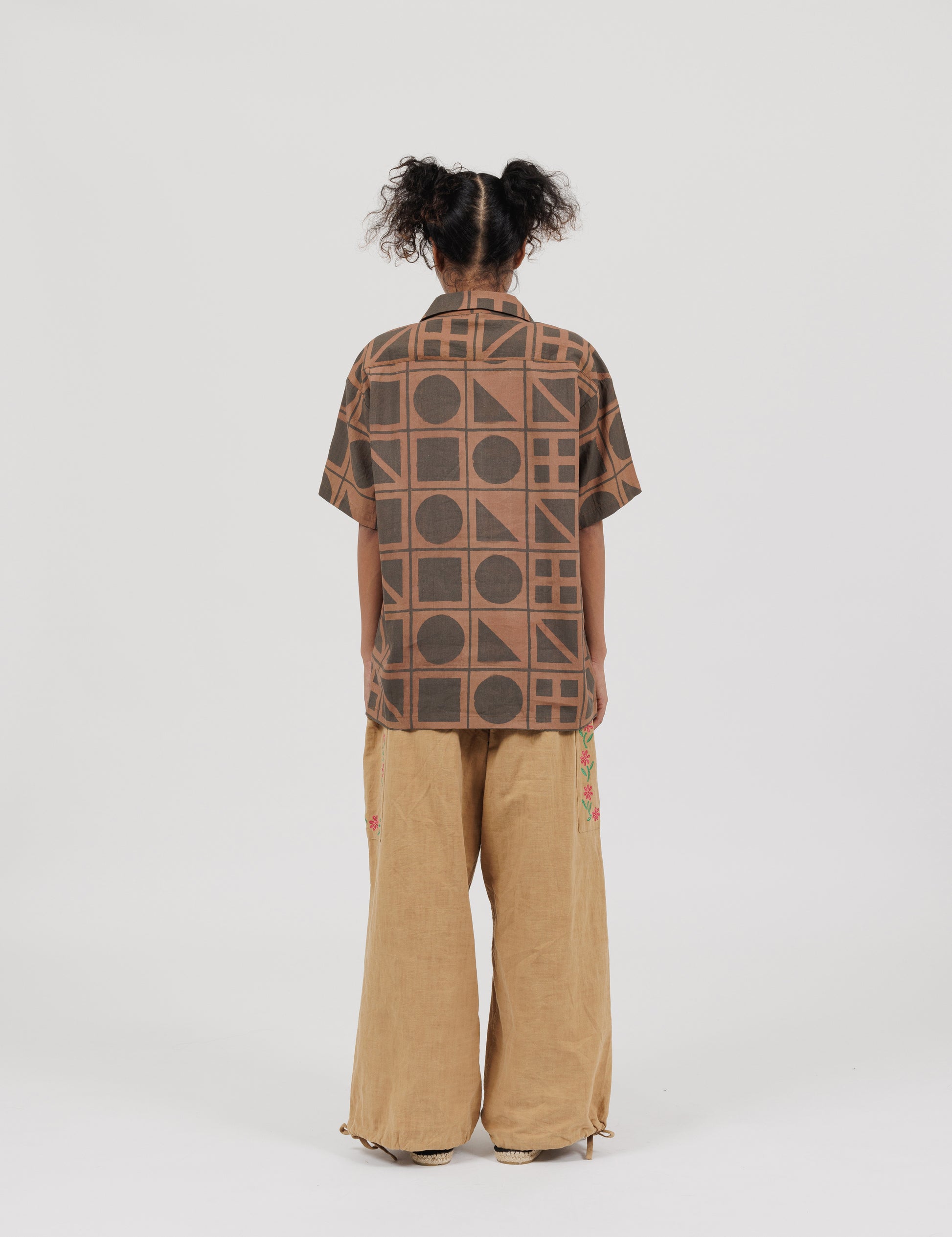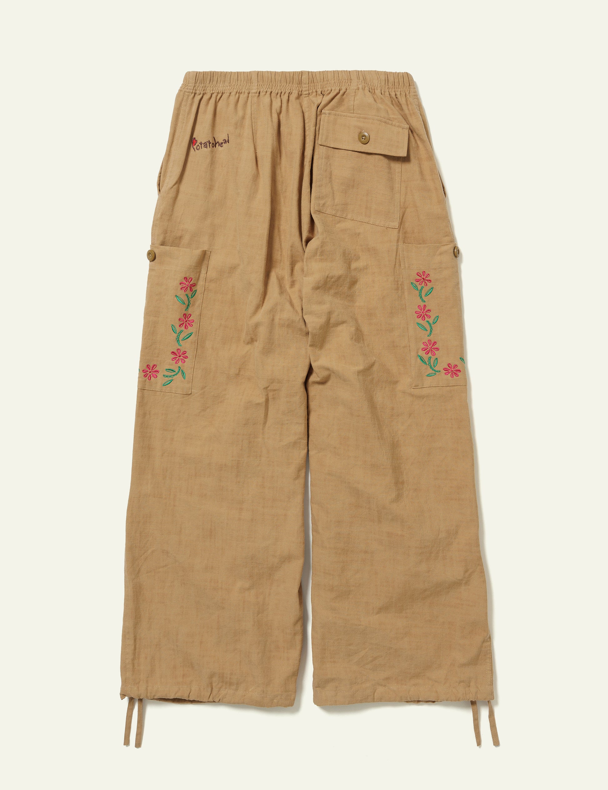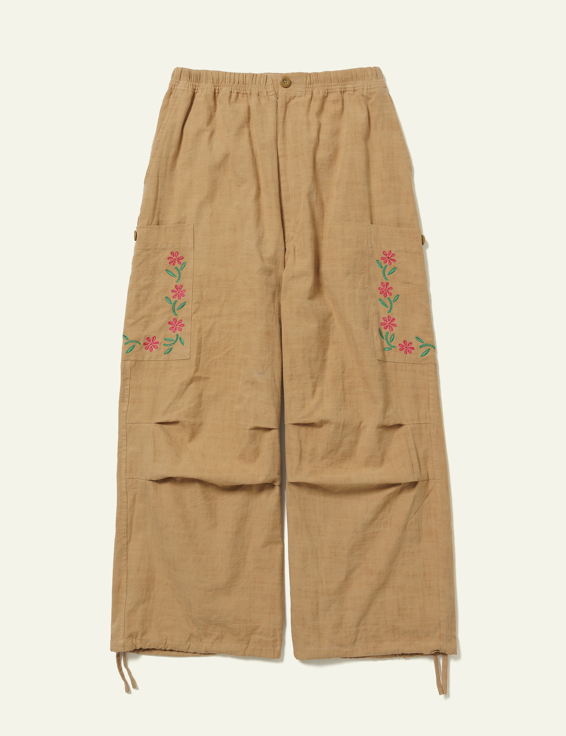 Dyed with plants, framed with flora-inspired natural embroidery, completed with classic utility pockets and drawstring.