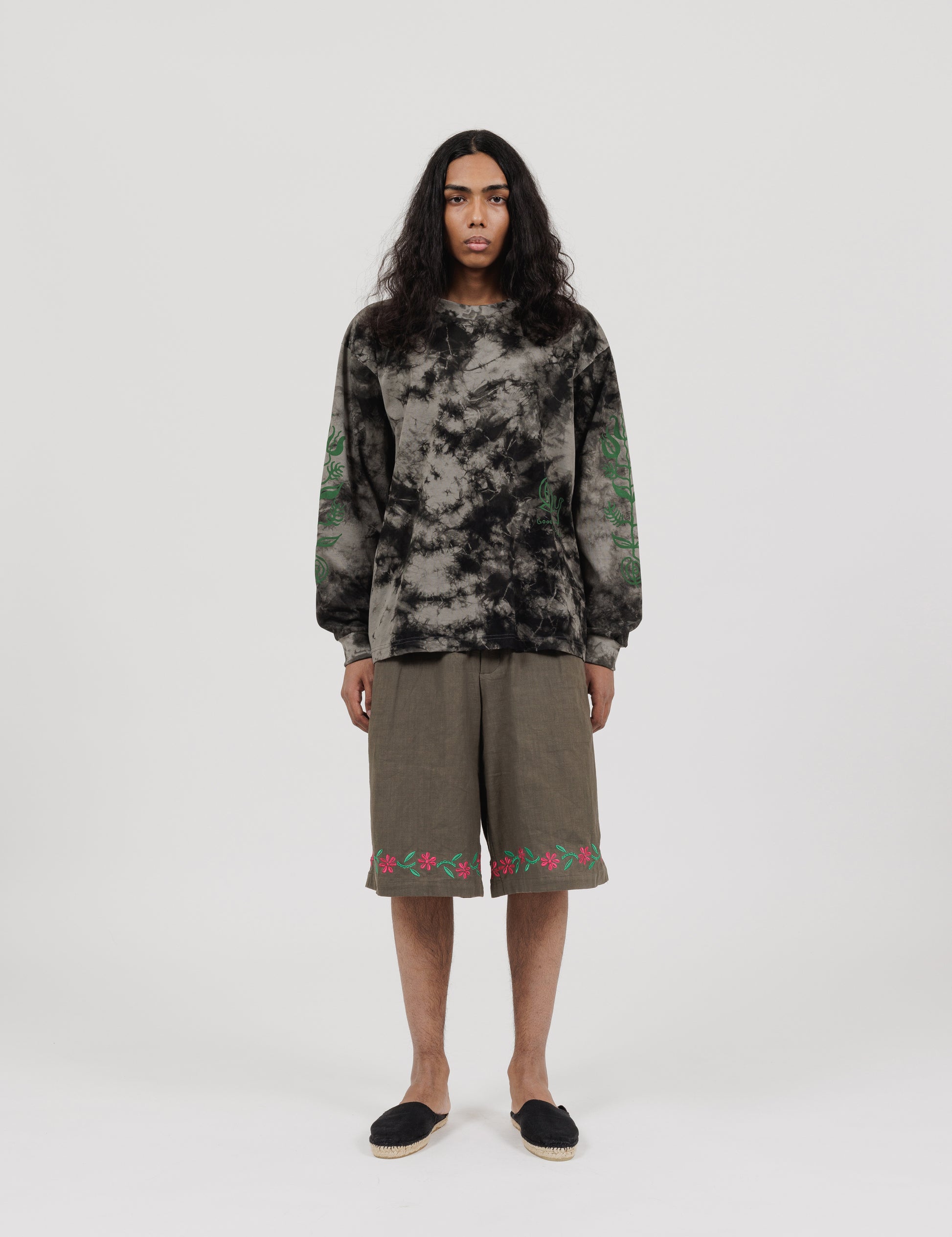 Naturally dyed with plants, silk printed with snail imagery representing nature's own circularity and a "Seed of Life" motif.