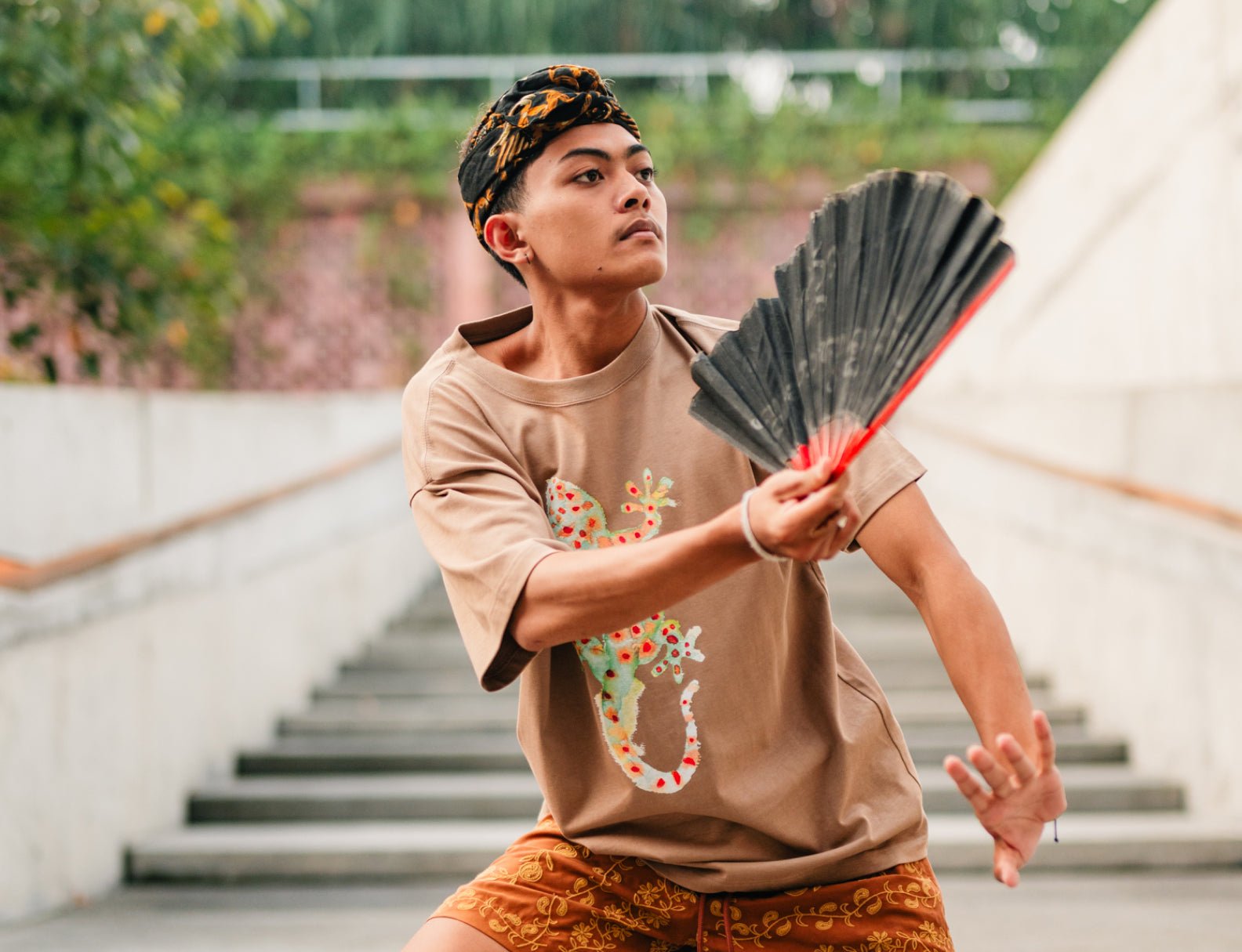 Our lookbook features Bumi Bajra – a Balinese arts community dedicated to keeping traditional Balinese dance, music, and theatre alive. They focus on involving the youth of Bali, offering them a platform to express themselves and stay connected to their cultural roots.